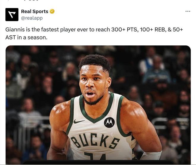 此战,字母哥还创下了NBA历史第1的神迹。字母哥本赛季9场比赛已经得到至少300分100篮板50助攻,NBA历史最快。