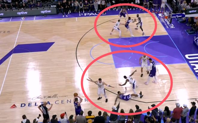 可是他们把球发出来的同时,本来准备去接球的爵士球员乔治已经被湖人队球员给推倒了,这球也没吹,这是爵士队的哈姆教练彻底暴怒的一个原因,他觉得湖人在发球之前已经犯规了。当时这个乔治被推倒在地上,本来是去接球投绝杀的,追防的斯玛特居然把对面核心放倒了,球接不到了绝杀战术自然也没有完全跑出来。