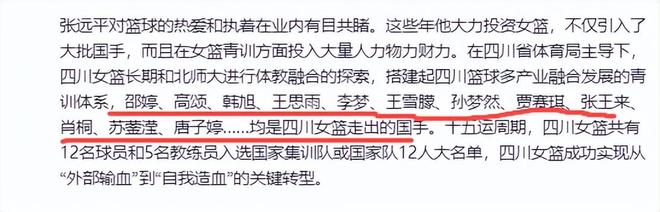奇怪的是,今天知名媒体人付政浩在社媒发表文章为四川队和四川女篮投资人张远平包打不平。付政浩老师先是夸了四川队一番:“张远平对篮球的热爱和执着在业内有目共睹。在四川省体育局主导下,四川女篮长期和北师大进行体教融合的探索,搭建起四川篮球多产业融合发展的青训体系,邵婷、高颂、韩旭、王思雨、李梦、王雪朦、孙梦然、贾赛琪、张王来、肖桐、苏蓥滢、唐子婷……均是四川女篮走出的国手。十五运周期,四川女篮共有12名球员和5名教练员入选国家集训队或国家队12人大名单,四川女篮成功实现从“外部输血”到“自我造血”的关键转型。”