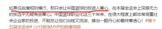夸过四川队后,付老师又帮助四川女篮找失败原因,他称“有些事情也超出了比赛范畴和球队能掌控的范围,这让坚持投资女篮的张远平有些失望和寒心,对某些比赛和某些现象产生深深的无力感。如果任由潜规则横行,那只会让中国篮球的投资人寒心,在本届全运会上深感无力的张远平无疑有些寒心。”